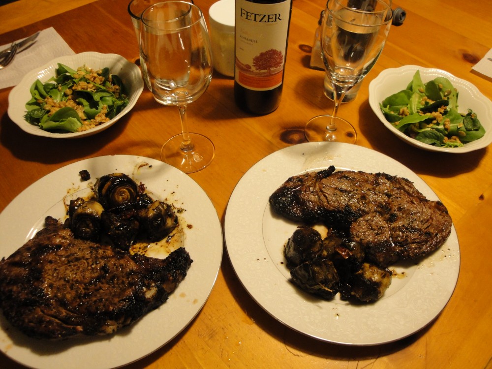 Steak Dinner with Artichoke Hearts, in olive oil and balsamic vinegar reduction sauce, with crumbled bits of dried fig, tomato, and fresh herbs from the garden. Side salad with baby lettuces I just picked, pan toasted walnuts & pumpkin seeds with butter & sea salt. Topped with my “Live Blue Cheese Dressing”.