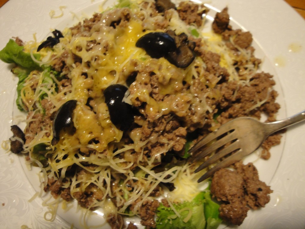 What a great lunch this is, 1 & 1/2 Cup of baby greens, my own ground beef, gently simmered in a little olive oil, with garlic, sea salt, & fresh ground pepper, 1/2 oz of two different Irish cheese (from pastured cows) crumbled black olives.