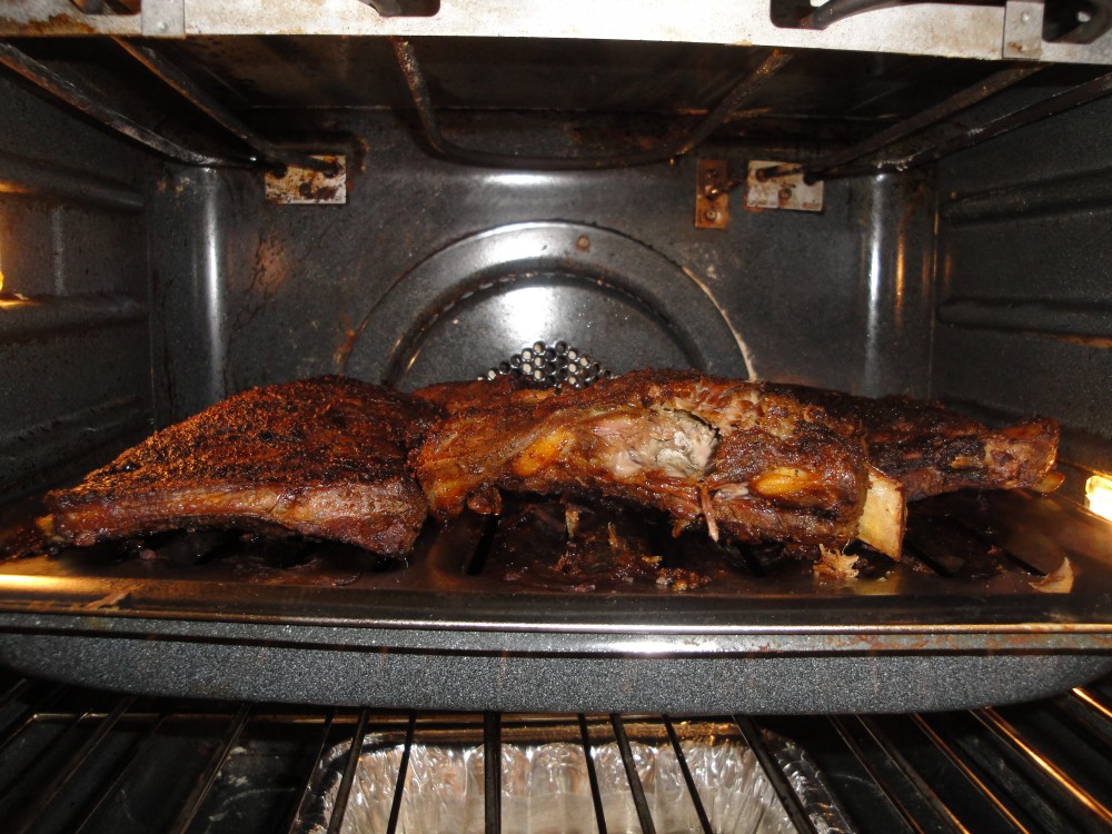 On Monday and Tuesday we had 35 mile an hour winds, and I finally realized there was no way I was slow cooking ribs in the weber. What else could I do? I set my convection oven at 250, put a pan of water in the bottom, and the ribs on the middle rack. After the 1st hour I turned them down to 225. 5 hours later sauced them, let them ride another hour, then turned off the oven and waited for dinner….Mouth watering, just want to try to eat slow, show some self-control.