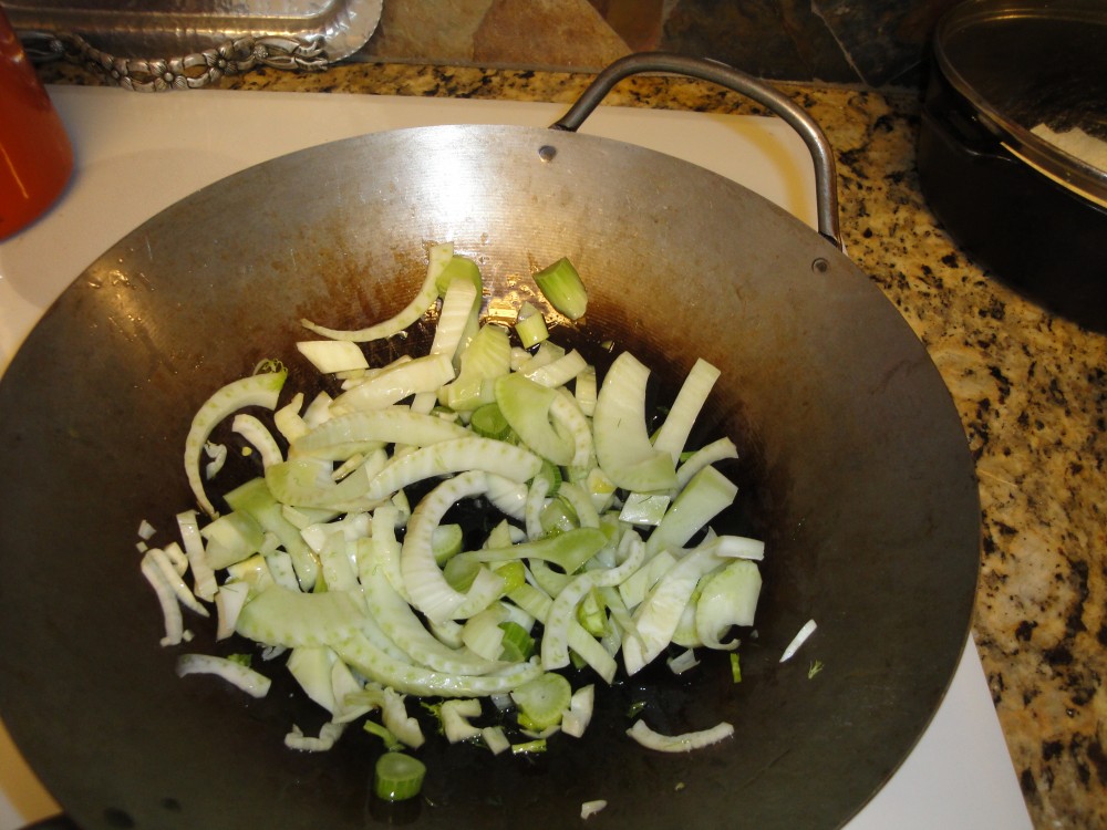 as Fennel/Anise everywhere today. Florence Bulb Fennel, should be bought fresh at the Farmers Market. It is particularly hard to grow in a garden because it easily cross-pollinate, so it needs lots of isolated space, also, rich soil, spoils its wonderful oils, aromas and nutrients, which are best as soon as possible after harvesting. The bulb is used and eaten as a vegetable, while the feathery leaves are used as herbs. Here it’s used in my steam-fry recipe.