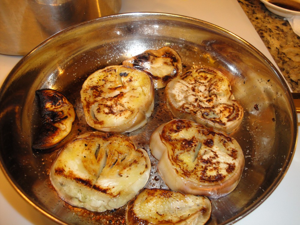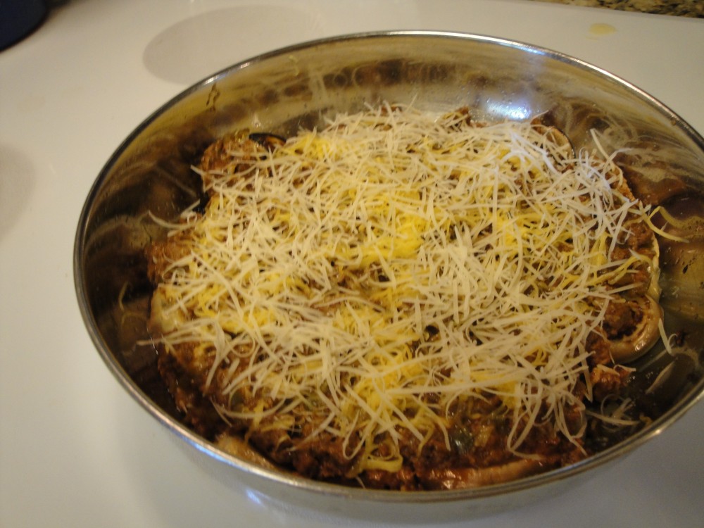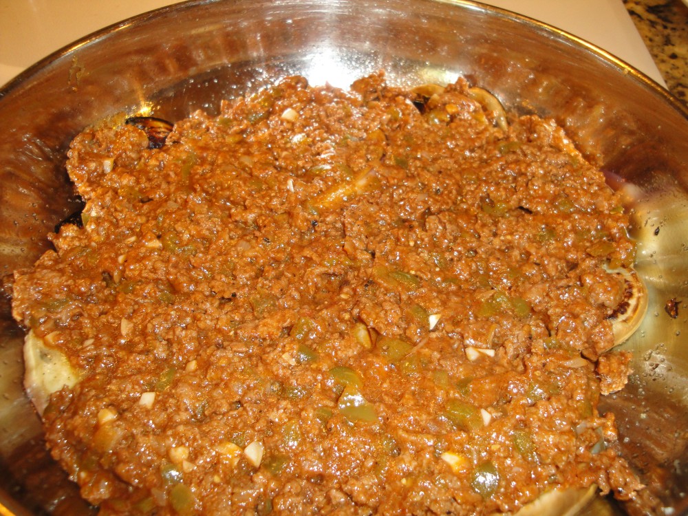 Chop vegetables, melt lard on medium, add vegetables and brown them. Add broth, cook 4-8 minutes, then tomato sauce, and do the same. Add salt & pepper to taste, then beef, stir and break up, let simmer very low, while cooking the eggplant. To cook the eggplant use medium heat, place sliced eggplant in pan drizzle with oil, a bit of salt, cover and cook 5-8 minutes until browned, repeat on other side. Eggplant is done when tender. Cover with vegetable meat sauce, top with cheese, and whatever you like, I added crushed olives, and fresh chopped chives, but fresh basil & oregano would be another option use your imagination, and what you have.