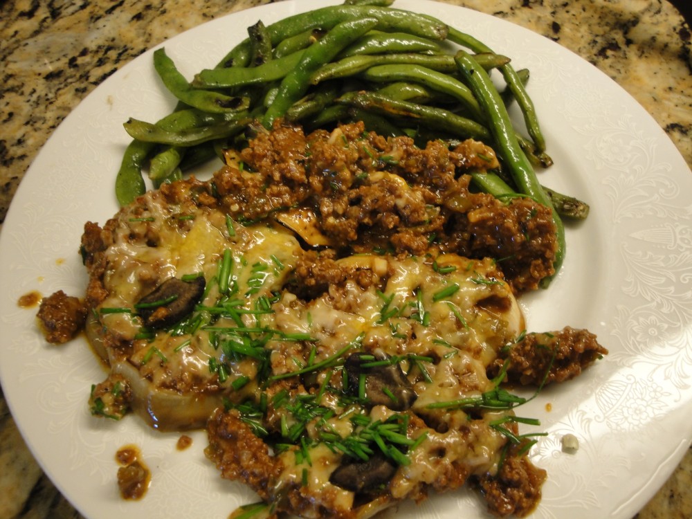 The eggplant, bell peppers, onion, garlic and green beans we grew. Your local Farmer’s Market, or Co-Op should have these fresh in season now. The tomato sauce was cooked down, again in our case tomatoes grown from seed in our garden, but also very available fresh and local, often now in heirlooms. The lard is mine home-made, from clean pork fat, and the beef bone broth also home-made from clean beef knuckle bones. The olive oil is from a local maker. All the meats, are form a local meat processor, Rawhide* the bacon is celery cured, and the ground beef is their Grass-fed/Grass-finished, as were the beef bones, and of course clean pork fat for the lard. I topped this with my cheese, and local cheese too.