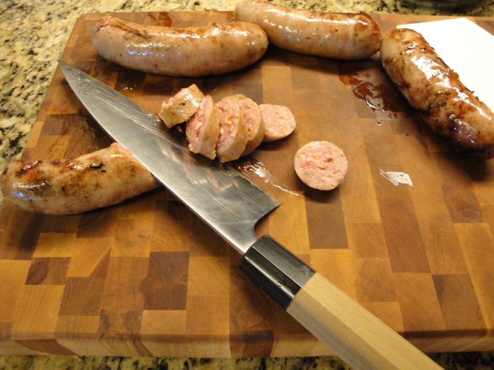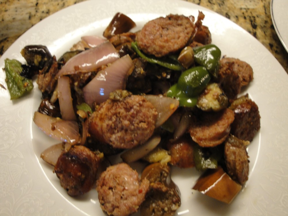 This is a simple dinner, it’s good for using up some of those fall vegetables like, eggplants, and peppers. Use fresh sausage, this one was Spicy Italian, from Dave’s Meat Service, but any flavor you like would work. We liked a char on the meat and vegetables, so I grilled them just long enough on each side to get that. I finished with a little steam-frying on the stove top. The whole dinner took about 35 to 40 minutes, and request have been made to have it again, always a good sign.