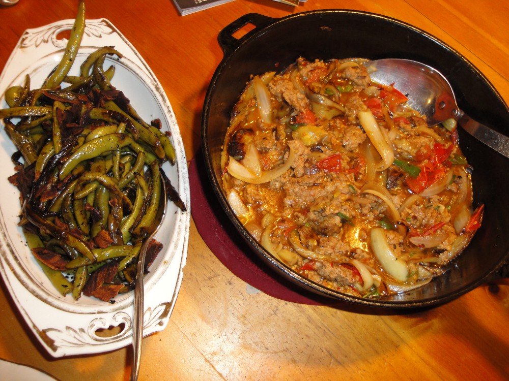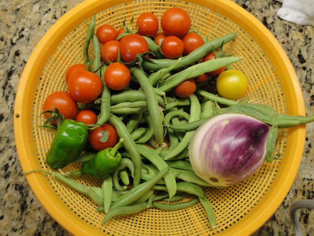 Filled my basket from the garden! Smashing the fresh cherry tomatoes as they cook, a bit of balsamic vinegar and the olive oil made a sauce just right for the eggplant and Andouille sausage to soak up. Added some Farmer’s Market onion and garlic. Ending with my flower garden fresh herbs; sage, thyme, and oregano. The green beans made the perfect side dish. See post for recipe. https://pamstacticalkitchen.com/2013/07/30/fresh-organic-green-beans-with-organic-bacon/