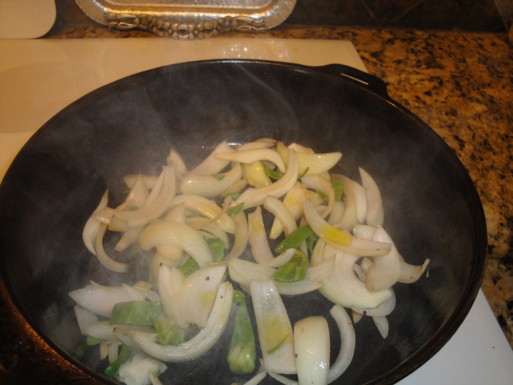 - Sauté sliced onions and bell peppers in olive oil & sea salt, until tender with some browning, then add chopped garlic, cook a minute more and remove.