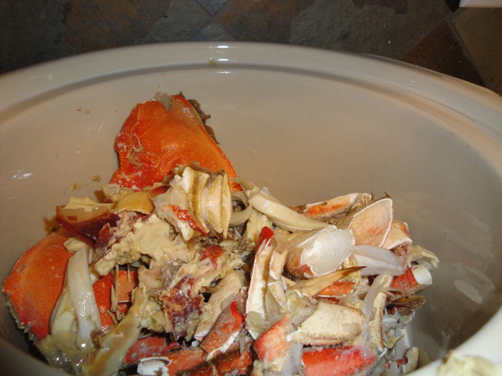 Place crab shells in crock pot. Crush crab shells. Cover with cold filtered water. Add 2-3 tablespoons of organic vinegar. Let steep for 1-2 hours. Bring to a boil. Simmer a day or so. Add vegetables and spices if desired in the last 3-4 hours. Strain decant and label. Refrigerate 4-5 days or freeze up to 6 months.