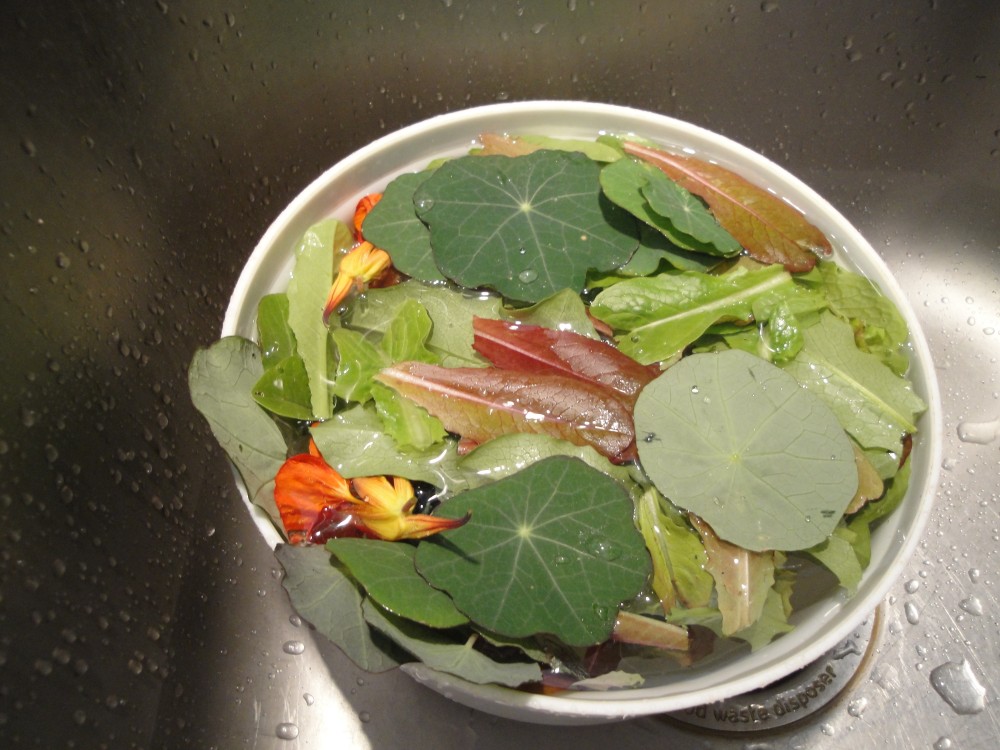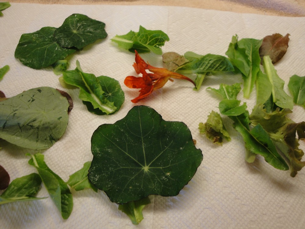 This salad was made with greens from my yard, including dandelion, nasturtium leaves and blossoms, baby lettuce, green garlic leaves, and snow peas. Dressing was my home-made Honey-Dijon using local wildflower honey, and walnut oil.
