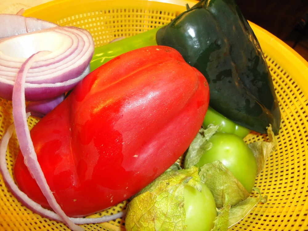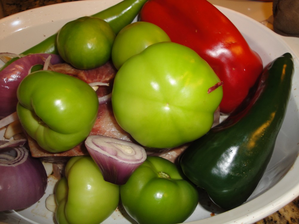 Char peppers onions and tomatillos in the roasting pan under the broiler. Remove and let cool. Coat meat with spices. Char under broiler. When cool enough to handle remove skins and seeds from peppers. Place vegetables under roast. Cover with a tight fitting lid, and roast in a low oven 250-300 degrees until tender and flaky when pierced with a fork. How long depends on the size, this was just over 3 lbs. and took about 5-6 hours. Pull the meat and vegetables apart with forks.