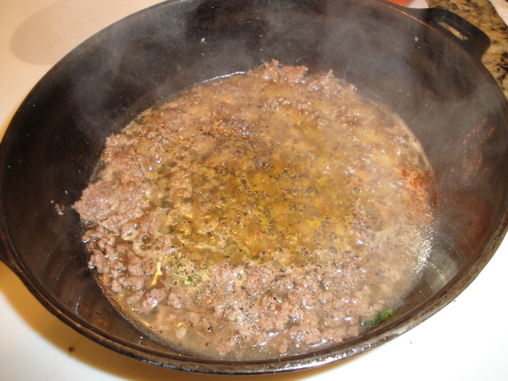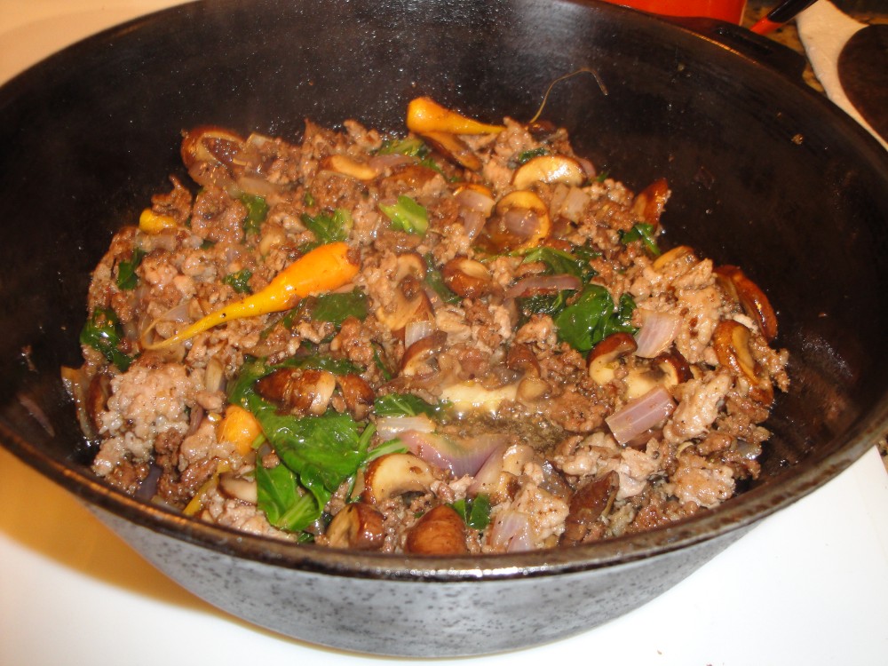Any vegetables that need to be eaten. Here I used crimini mushrooms, collard greens and baby carrots. Grass-fed ground beef, farmstead ground pork. Here I used about 1/3 lb. of each. Ground lamb, chicken or turkey would work as well. About 1/2 cup of bone broth. Cook the different types of meat separately. Vegetables with different cooking times as well. When done, combine all add lots of smoky paprika and your choice of other spices.