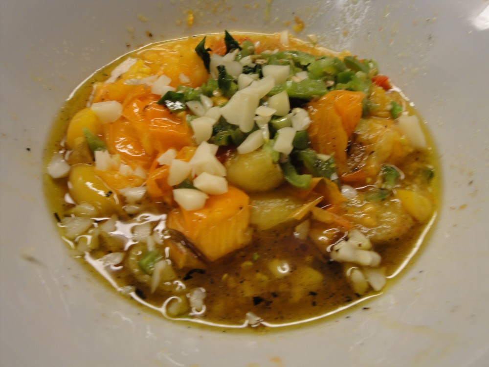 Roast all on a grilling dish as shown. Peel garlic. Remove steams from tomatoes. Chop all and mix. Be sure to save any juices that come out during the chopping process and add. Toss a bit of good quality olive oil over the mix, to further infuse the wonderful richness of the charred vegetables. Add bit of salt and enjoy.