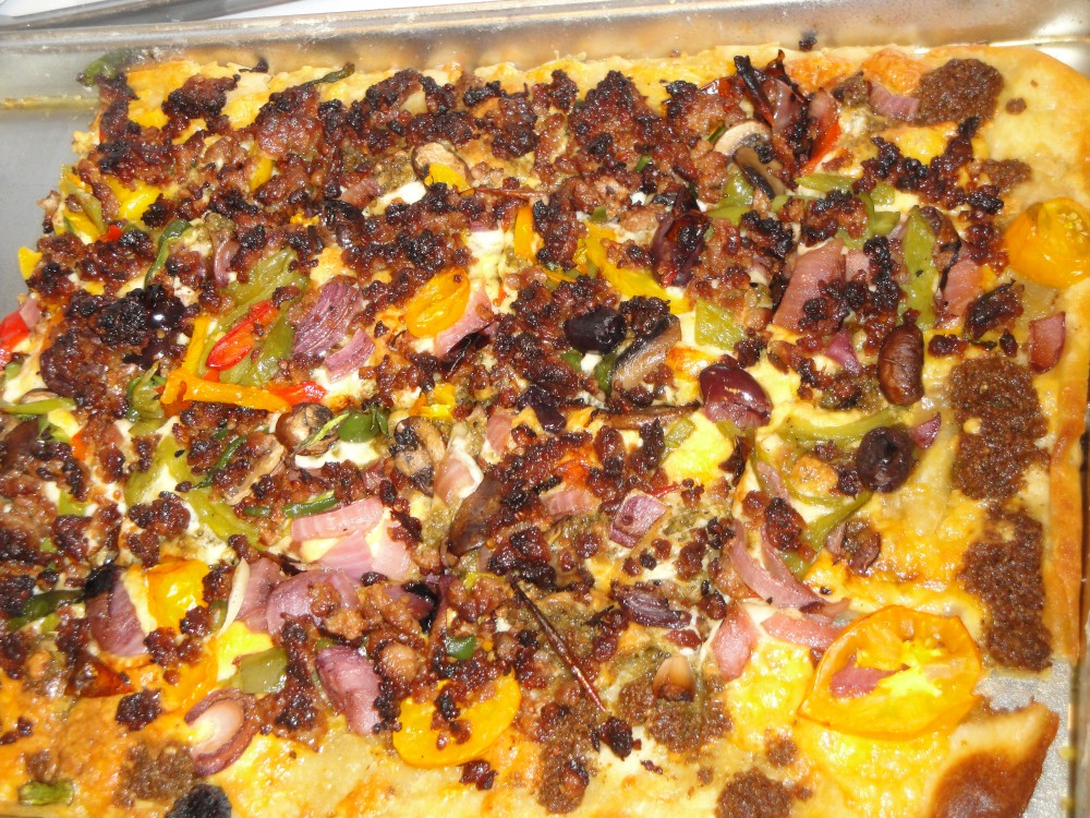 Most of the food was local, or home-grown. The pizzas were as seen in my post Artisan Sourdough Pizza Home Made Video . My husband Scott grows heirloom tomatoes, and peppers, and I used a ton of them. One of the sauces was a new recipe, (coming soon) “Blended Garden Fresh Pesto”. The tomato sauces were ,E-Z tomato sauce, both red and gold, and the always popular Chadwick Cherry Heirloom Tomato Pesto I used a verity of meats, Aidells Cajun Andouille, or Italian sausage. From Dave’s Meat Service I used farmstead pork for my Pork Chile Verde roast, bacon and ground pork. Lots of good cheeses, and olives. Everyone seemed to enjoy the pizzas very much.