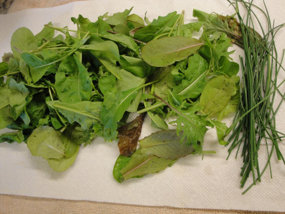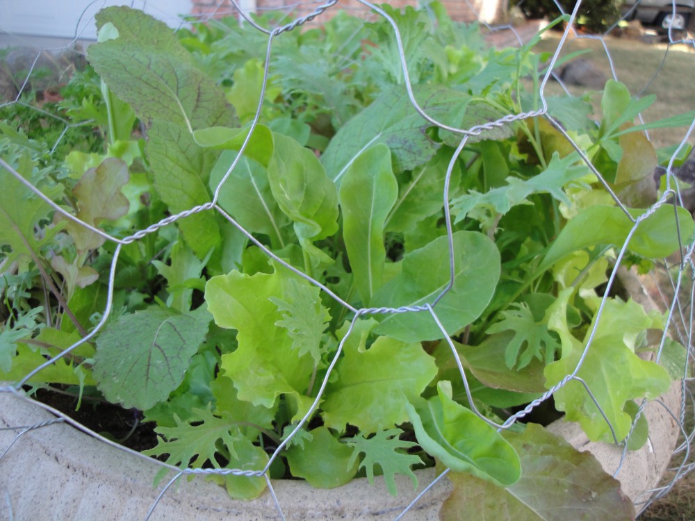 Keep evenly misted. Thin and enjoy the very savory young sprouts. When lettuce is 3-5 inches high remove the chicken wire. (Can be used later to drape covers over for frost protection.)