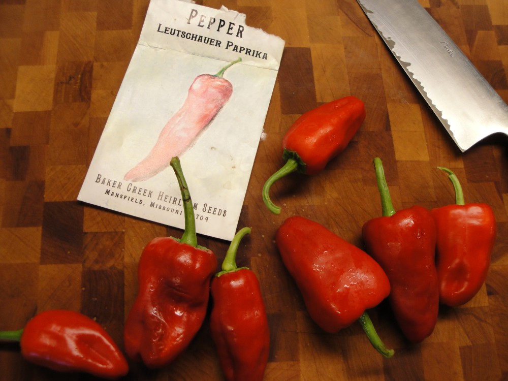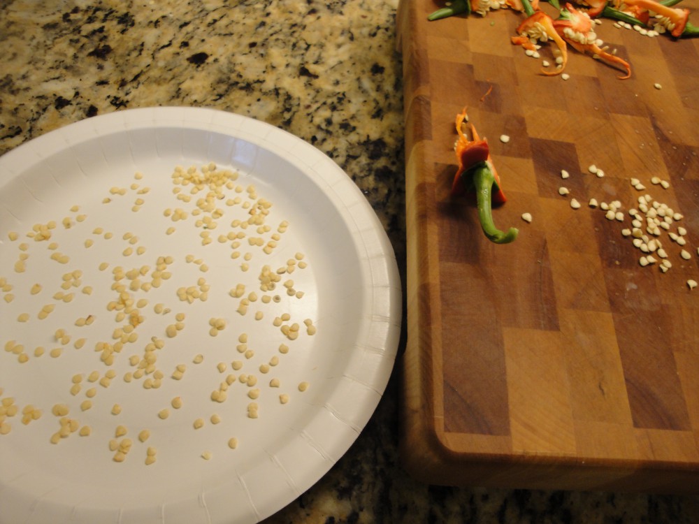Pepper seed saving is so easy, it’s a shame I haven’t done it before. Simply remove seeds, pinch off any pepper flesh or membrane. Place on paper plates and dry until seeds feel dry to touch and you can snap one in two. Not recommended to use paper towels which the seeds stick to. Every few days toss them a bit for even drying. I put mine on the top of the refrigerator for about 1 & 1/2 weeks. Store in a brown paper envelope. Put in a cool dark place, like the bottom drawer of the frig. It’s best to grow Heirloom peppers. Baker Creek Heirloom Seed Company is a good source.