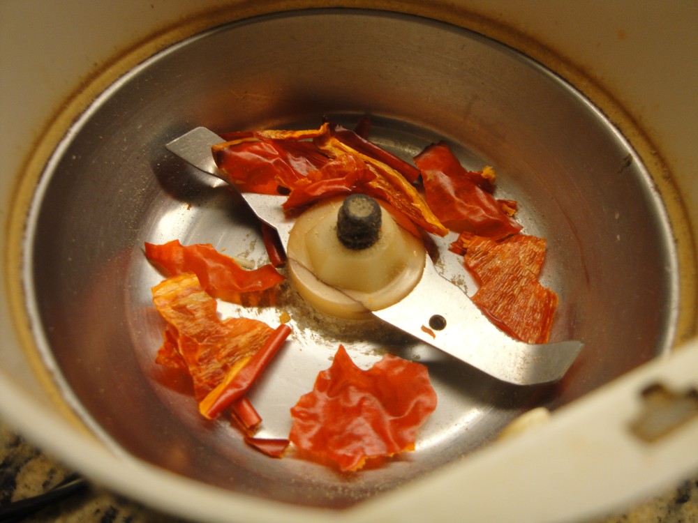 Clean and slice peppers. Save seeds if desired. Smoke as directed using what device and chips you have. I used wood pellets on the lowest one burner setting on a gas grill for about 1/2 hour. Next dehydrate. In an oven use the lowest setting and turn the oven on/off. In a dehydrator use recommend setting. When peppers are dry, grind to a powder with motor and pestle, or use a for spice only, coffee grinder as shown. Store in an air tight container in dark place. Remember although Paprika is a called a spice, it’s really a vegetable that can spoil, or mold if moisture gets to it. My 7 medium peppers made about 1/3 cup. Next year I’ll be growing a lot more!