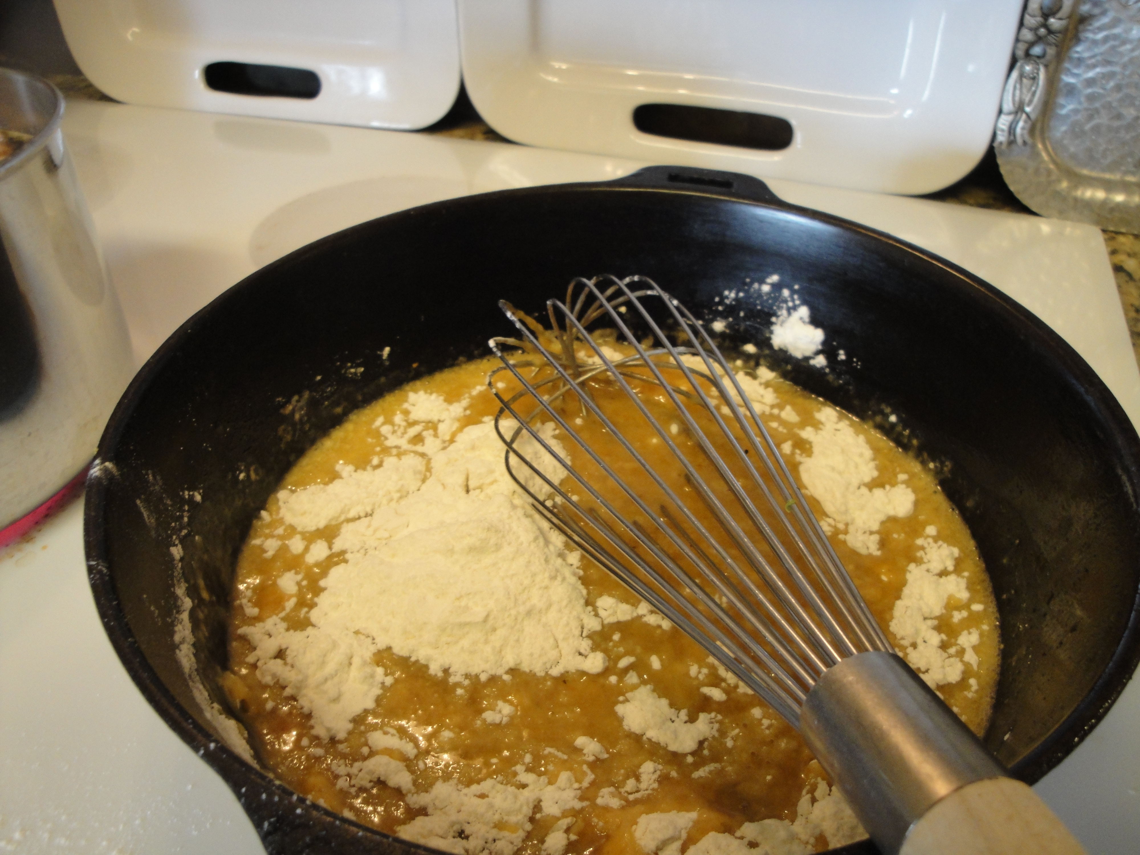 Place 1/2 to 1 cup of flour in skillet. Heat on medium high whisking constantly. After a bit it will began to brown. Cook until flour reaches nut brown. Add equal part of sweet butter. Make a paste add decanting’s from turkey roasting pan, and *Turkey Bone Broth, or giblet broth until it looks like gravy.