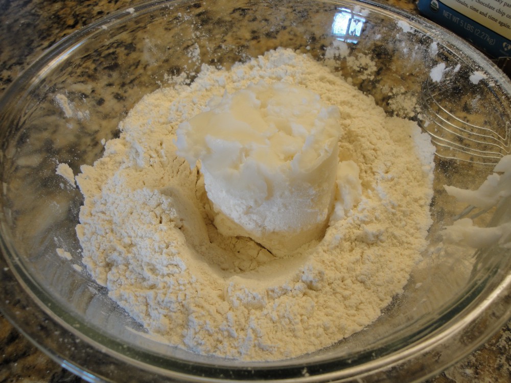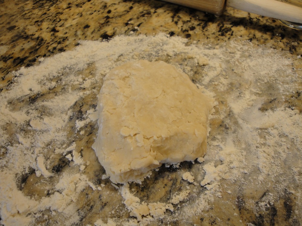 Make sure lard is cold. Measure flour. Mix in salt and sugar. Add lard and cut in with pastry cutter, or forks, butter knives, or your fingers. Cut well and fluff, (the fat needs to be cut not pressed, see picture above. The little pieces of fat will not all be the same size, but they need to be well distributed. Add I to 2 tablespoon of ice water. Gently press together. When it holds together it’s enough water, if not add a bit more as needed, but be careful, to not over handle. You can see above my dough was still a bit crumbly, not solid and pasty. (The dough can be wrapped and put in the refrigerator, until the filling is ready.) Divide dough in half. Lightly flour a surface for dough, press a bit to flatten. Rub flour over rolling pin. Roll disk from center out, turning to keep making the circular shape. Slide a pastry cutter or knife gently under the dough as you work it to help keep if from sticking to the surface. It might need a bit more flour. When the circle is about 3 or so inches bigger than the top of the pie plate and about 1/8 inch or a little more thick, it’s done. If dough has cracked apart, do not redo by rolling, just push it back together. Now lift the dough by rolling it onto the rolling pin, then unroll it onto the pie pan. If this is confusing, try doing it with a towel first to get the hang of it. Lightly press dough in the dish and crimp the on top. You can get fancy with this or just do it stupid simple like I did. Again push together breaks. Cut off any over hang. Now your pie shell is ready for filling.