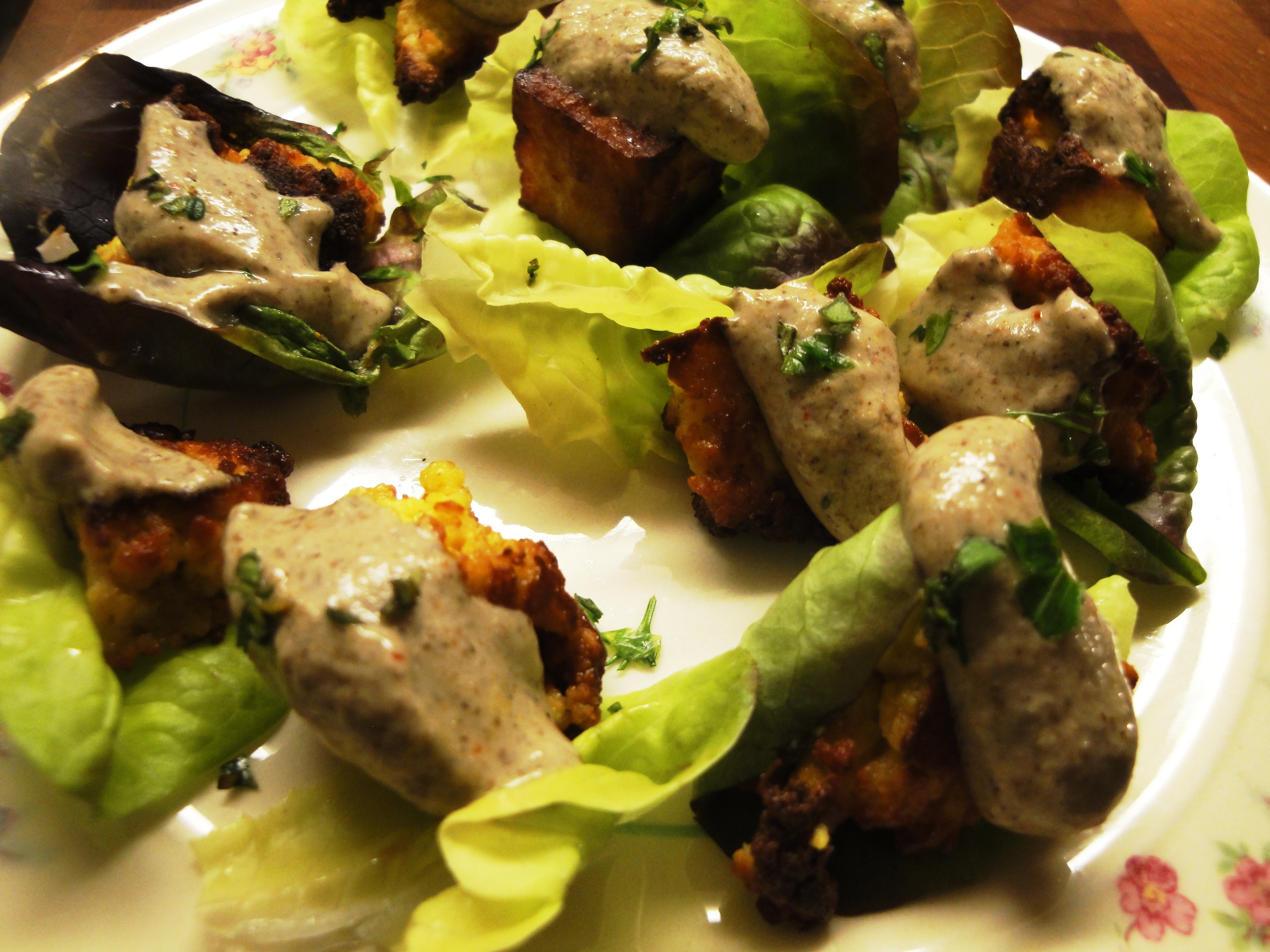 Heat 2-3 tablespoons of the unrefined Peanut oil on medium. Cube cheese, and brown pieces on all sides. Drain on towel. Place in lettuce cups, top with peanut sauce and chopped fresh herbs. Enjoy, this wonderful artful healthy treat.