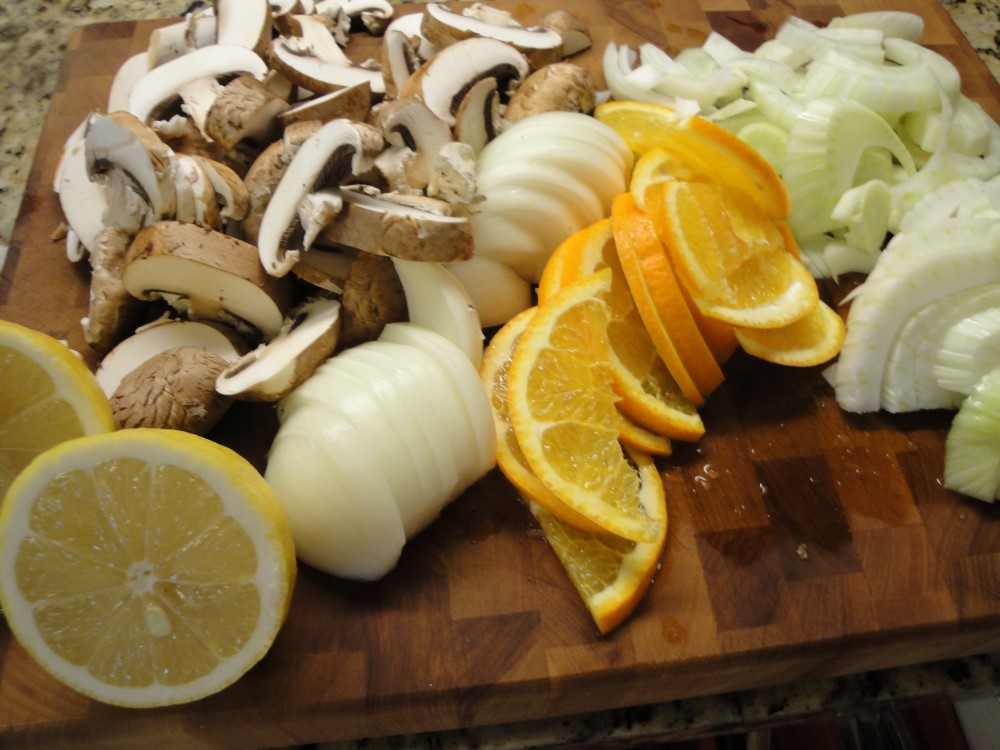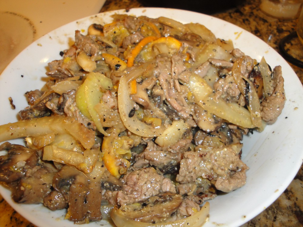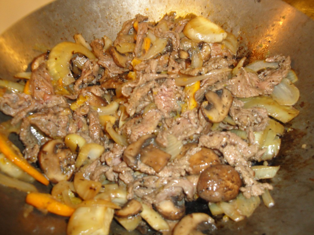 Pat beef dry, place in dish or plastic bag. Cover all surfaces with a sprinkling of sea salt, peppers, olive oil and crushed garlic. Let meat come to room temp. Slice thin 1/4 inch then about 3-4 long 1 and 1/2 wide. Remove fat and gristle. Slice vegetables and orange. Use wok or cast iron skillet at high temp. Quickly cook each ingredient separately, adding lard as needed. Onions, fennel and orange will develop a sweet charred edge. Mushrooms will need the most fat to achieve browning. The beef should be cooked last, just to pink, add back in the other ingredients, Tahini sauce if desired, toss, and enjoy!
