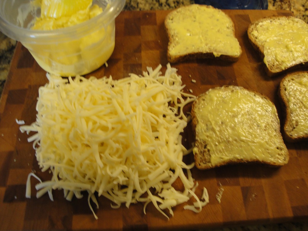 Spread a thick layer of mayo on top of bread. Grate 1 once of cheese per sandwich. Heat a cast iron skillet on medium high. Place a pat of butter in for each slice. Place mayo covered side of bread on top of butter. Add cheese, and top with a pat of butter, and a couple shakes of salt. Place bread on top, with mayo side up. Flip when toasted. Press a bit with tool. Done when both sides are toasted to your liking. Enjoy! Pairs well with a glass of “Fetzer Gewurztraminer”!