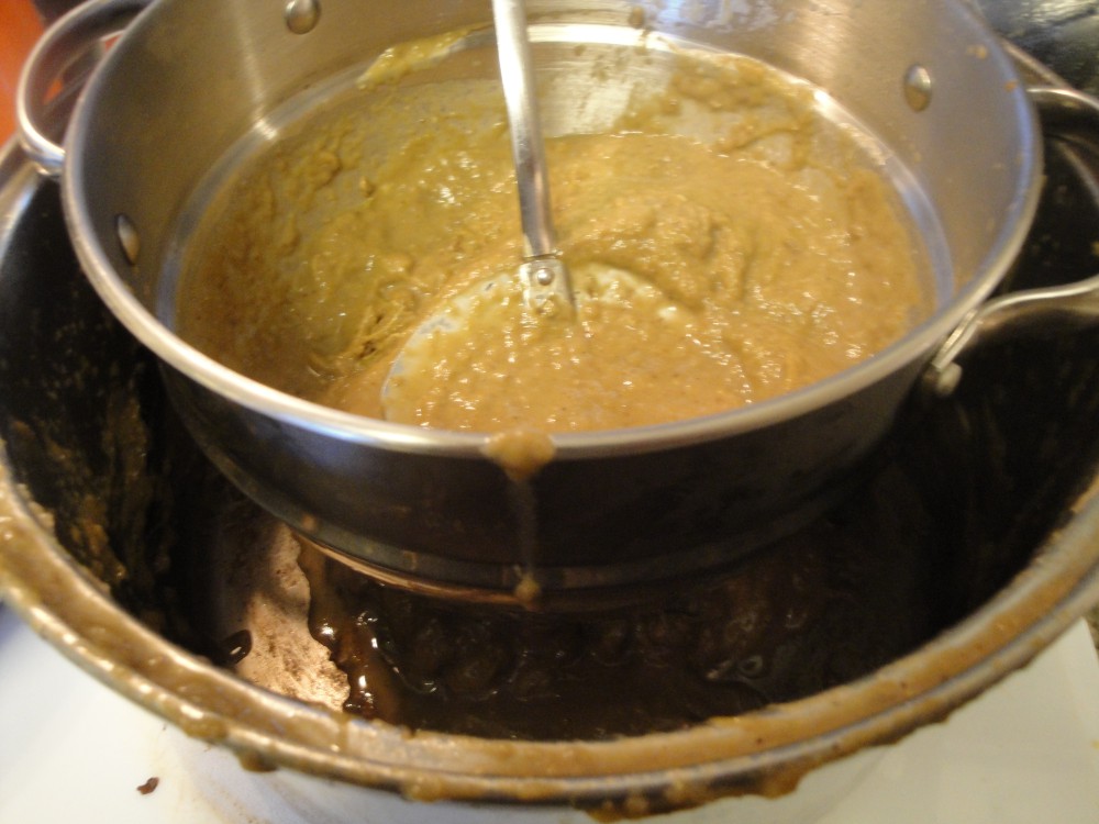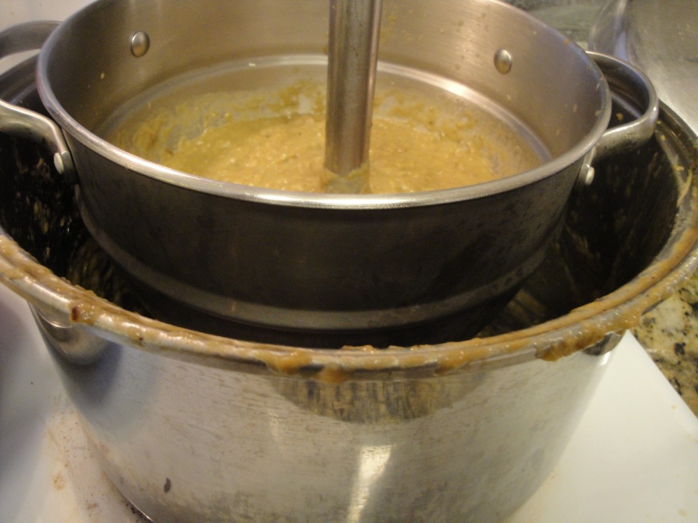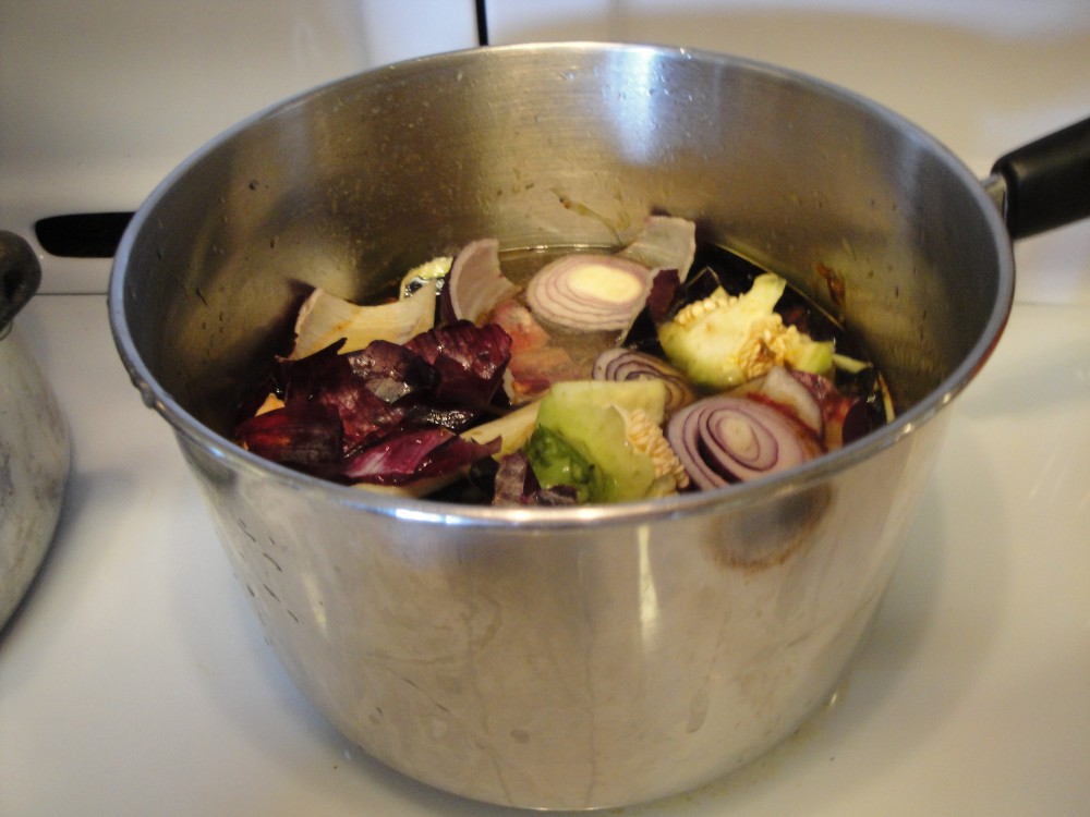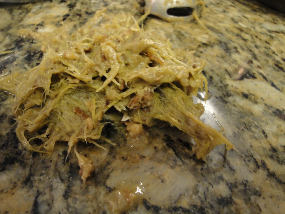 The asparagus stems are very fibrous. Cook them down until tender about 30 minutes. Add chopped eggplant, and cheese rinds if using, simmer together 30-40 minutes more. In a separate pot simmer chicken bone broth, and scrap vegetables, about 30-40 minutes also. Strain vegetables from broth and add to pot with asparagus and eggplant. When eggplant is tender strain the asparagus eggplant broth mixture. Press through as much as possible. Sometimes I let everything cool then just squeeze it with my hands. Other tools are a potato ricer, hand blender or food mill. See the picture of the stringy fibrous pulp, good for compost, but not digestible.