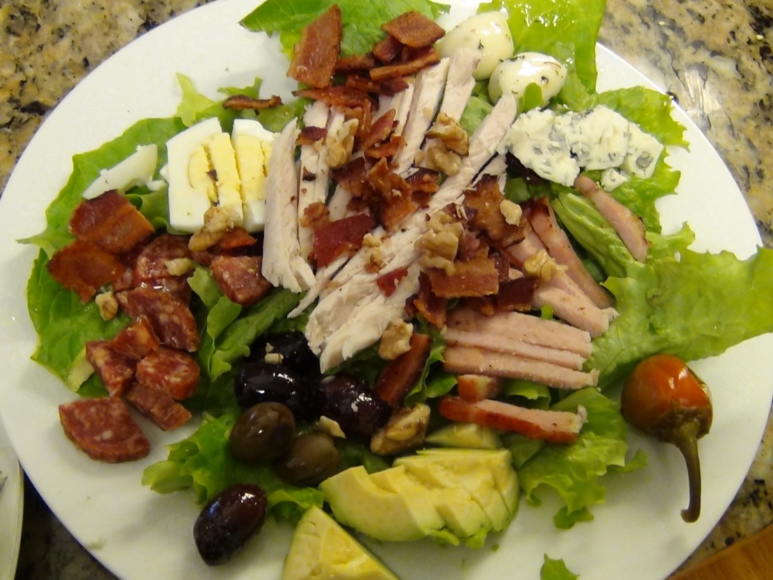 Love this with home-grown lettuce, uncured “No nitrated or whatever” bacon, fresh avocado, roasted turkey, fresh mozzarella balls, eggs, olives, any fun food! …E-Z!