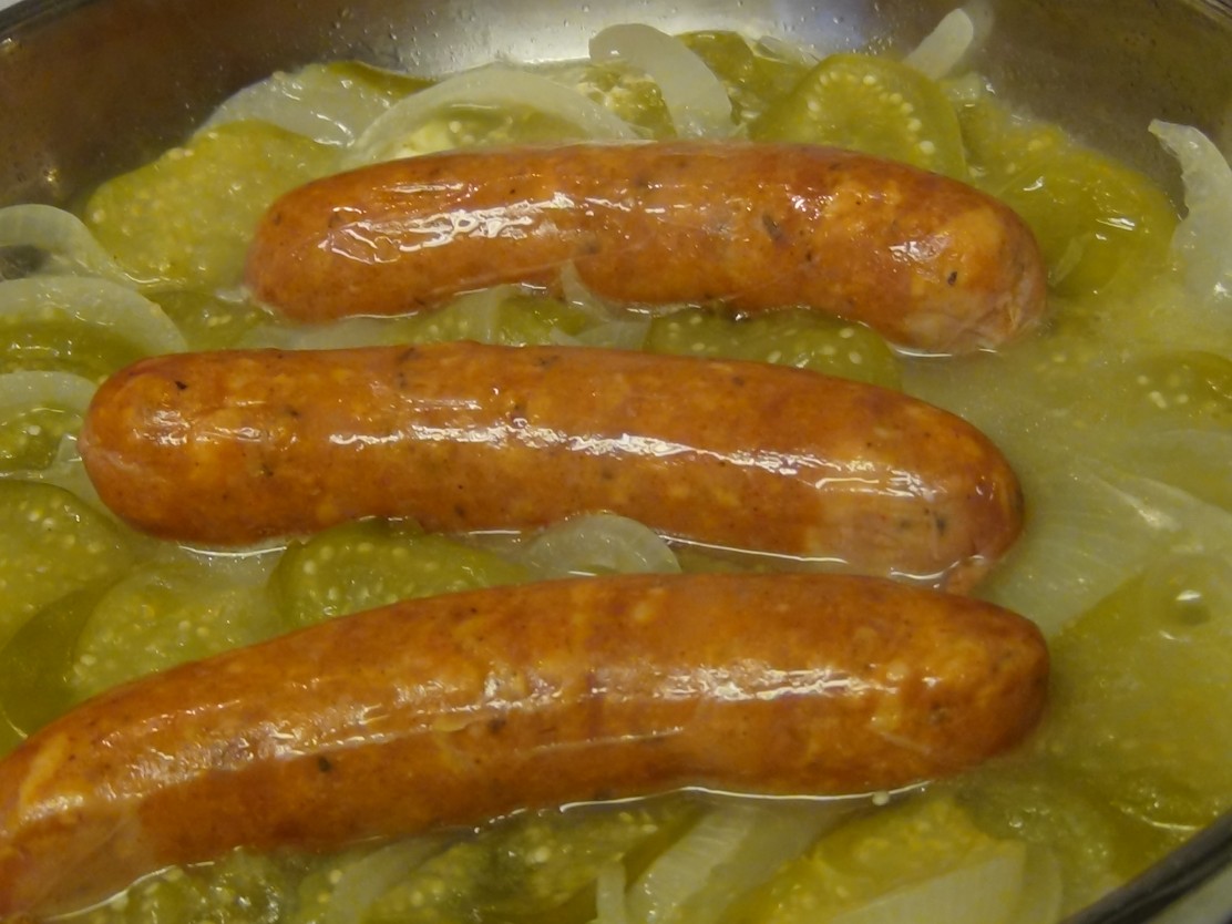 On medium heat cook tomatillo, onion bit of fat, salt, paprika, Mexican oregano, and ground cumin. When softened about 10 minutes, add sausages and broth. Cook another 20-25 minutes. Remove sausage links and slice. Make toast. Divide sausage into bowls. Cover with soup. Top with cheese and peppers. Serve with buttered toast. Enjoy!