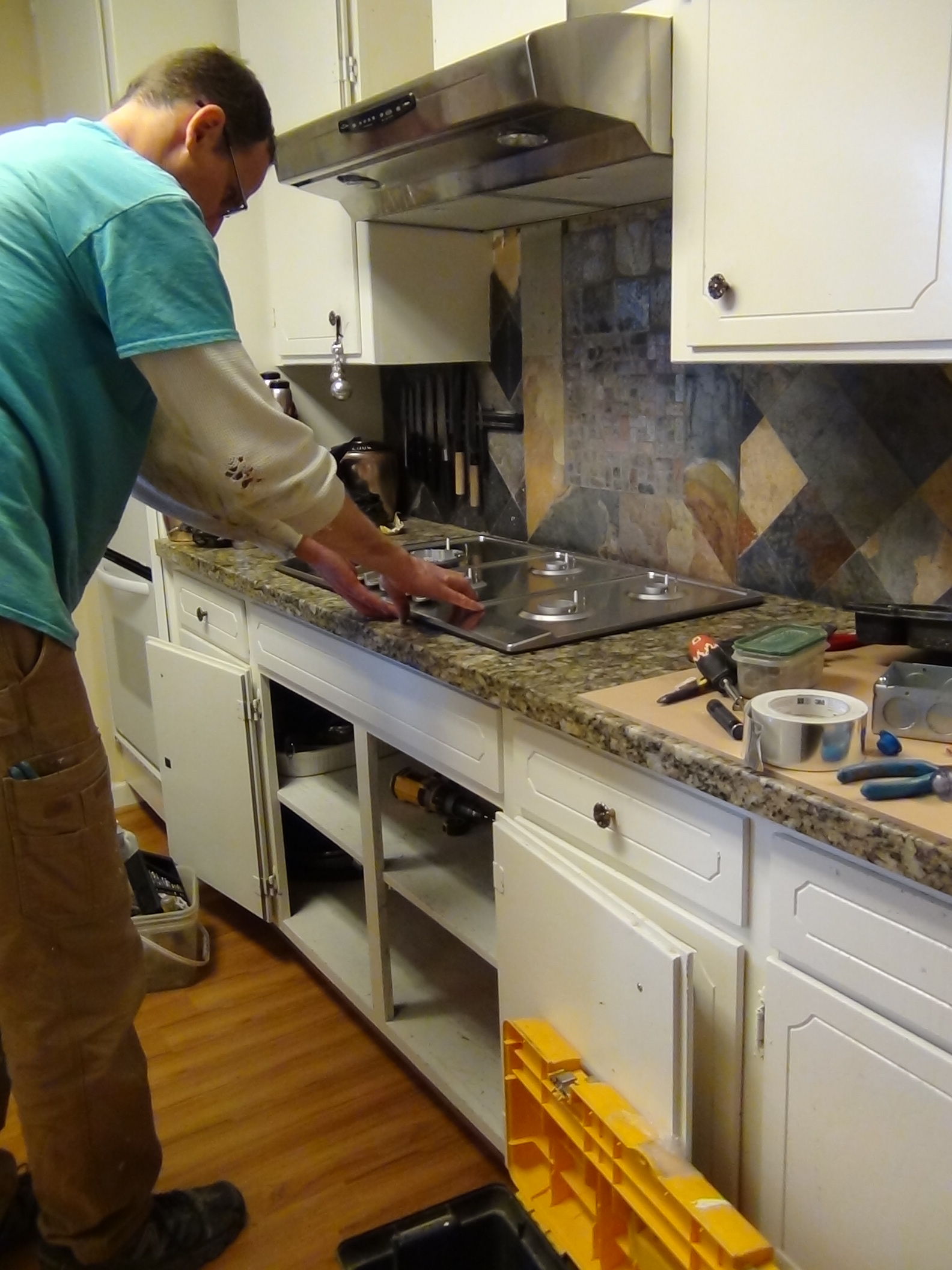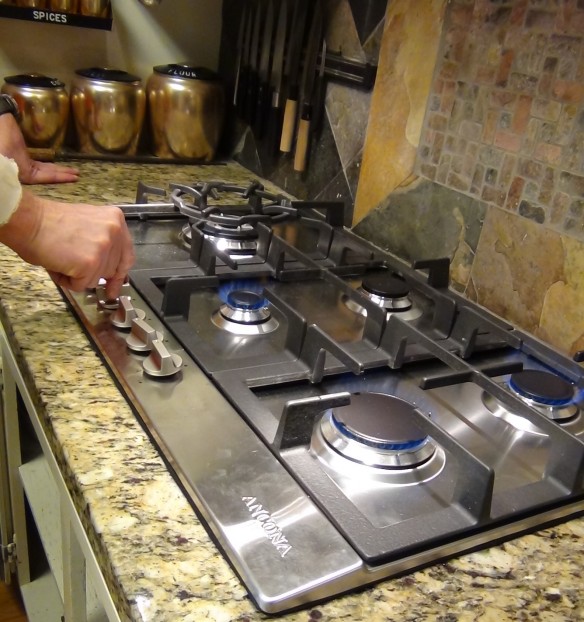 My old 30″ glass cook top, was in a 31″ cut out. This makes it very difficult to replace it with a 30″ gas cook top. Looking on the internet I found this is a problem in other homes. For months I searched for a replacement gas cook top that would fit. Keep in mind the counter is granite so going to the next larger common size 36″ means going to the trouble of cutting into the granite counter. Finally I found a 5 burner 34″ gas cook top that fit into a 30″ or so hole. This seems to be the perfect solution. The microwave hood was not working and also needed replacement. My nephew Noah and his son Lestat, installed both the cook top and a hood range, in less than 6 hours including running the gas line. They did this on Saturday, and I was super happy they finished, because the next day was my super bowl party! Here are some before, during and after pictures. The cook top is Ancona, from Costco.