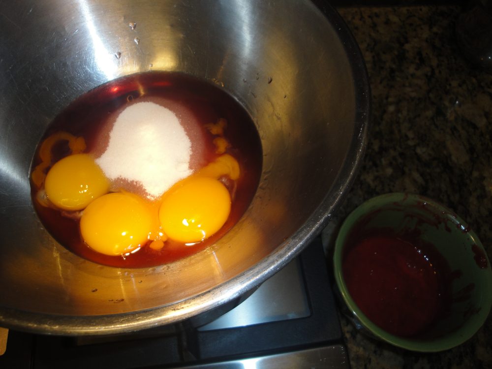 Add duck eggs yolks, sugar and Chambord to bowl. Beat