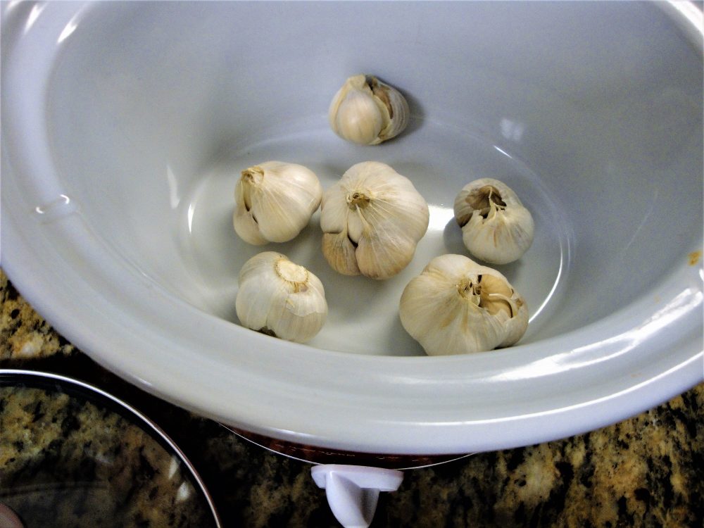 Clean & dry garlic. Put in crock pot on warm setting.