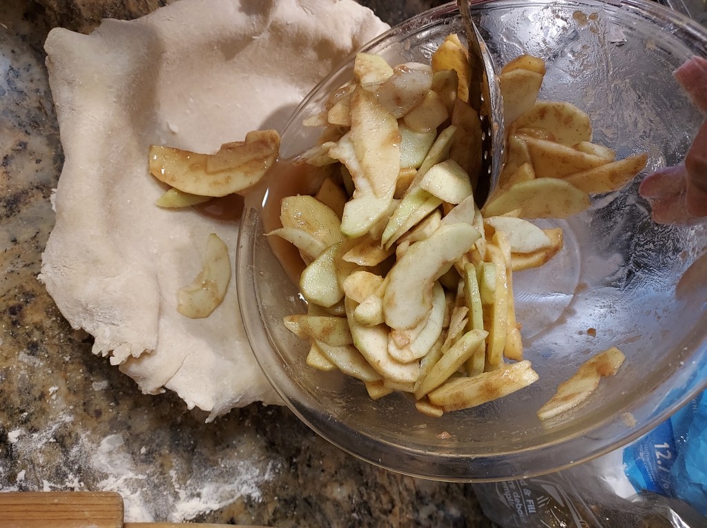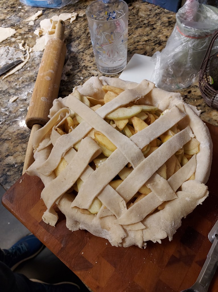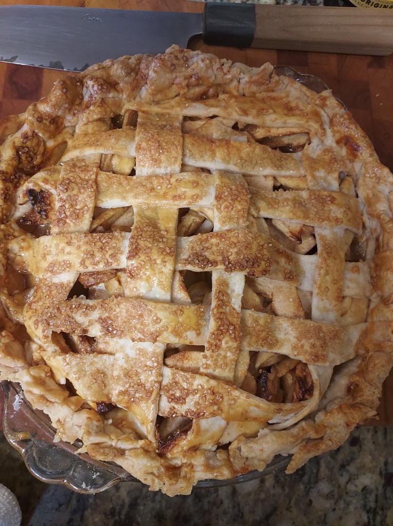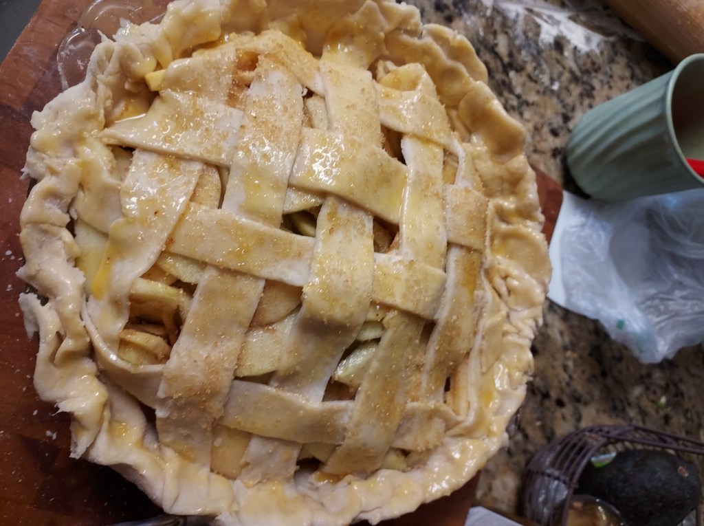 Slice 6 apples dot with lemon juice. Coat with 2/3 cup sugar, 3 tablespoons flour, 1/4 teaspoon each, nutmeg, Cinamon, and cardamon.1 tablespoon Calvados apple brandy.Roll out 1/2 of dough to 1/8-inch and about 12 inches or more roundPlace in bottom of pie dish. Add apples.Roll the rest of dough same as before. Cut a round circle, slice dough and lattice on top, crimping the edges together.Brush with egg wash and sprinkle with sugar. I used raw sugar.Bake the pie at 375°F until lightly brown, 40 to 60 minutes, then 350°F for 20 or so minutes.Perfect with Vanilla Bourbon Salted Caramel https://pamstacticalkitchen.com/2016/09/21/ice-cream/Ice Cream and Salted Chttps://pamstacticalkitchen.com/2016/09/20/salted-caramel-sauce/aramel Sauce links below. https://pamstacticalkitchen.com/2015/12/04/best-pie/