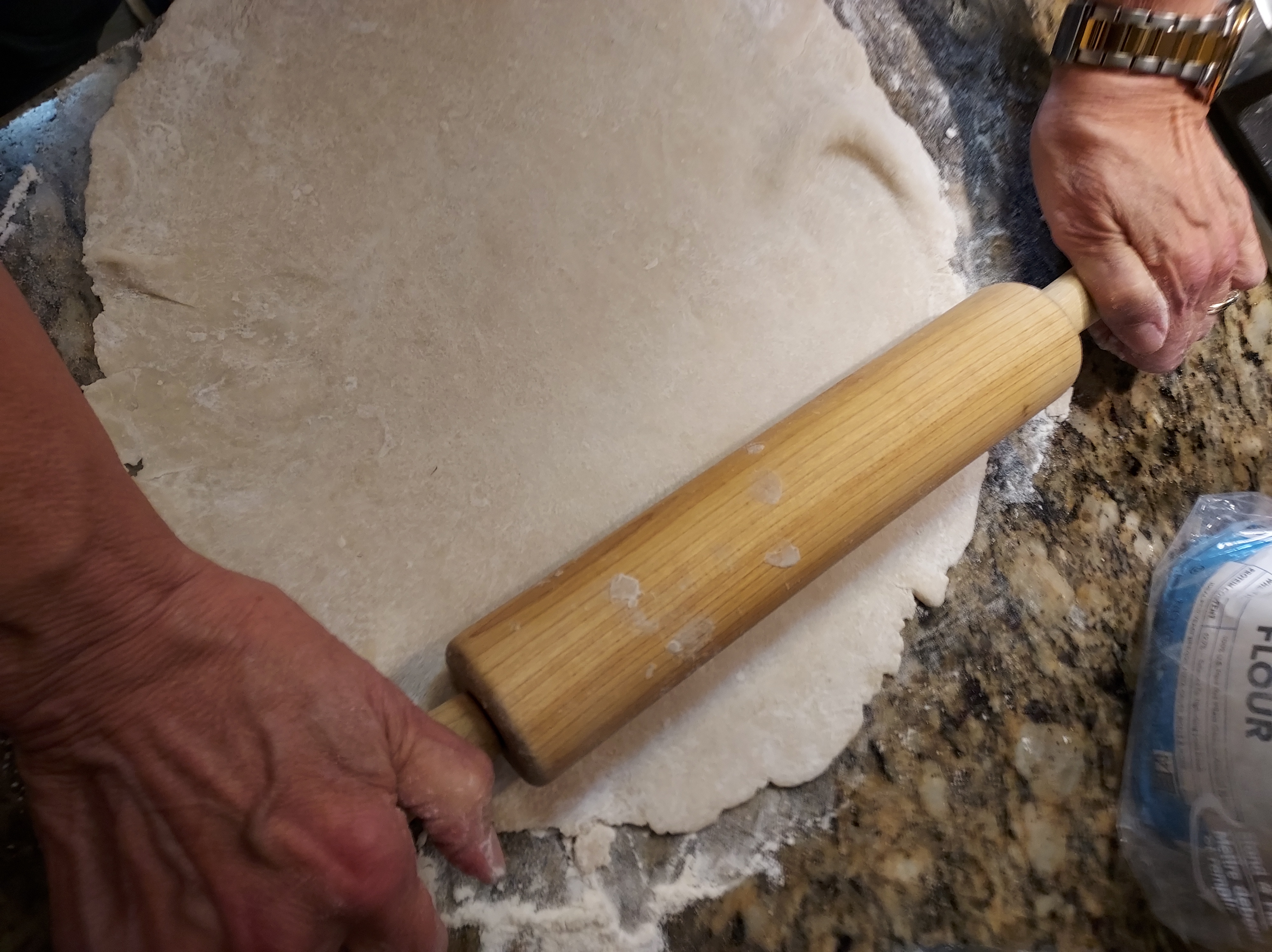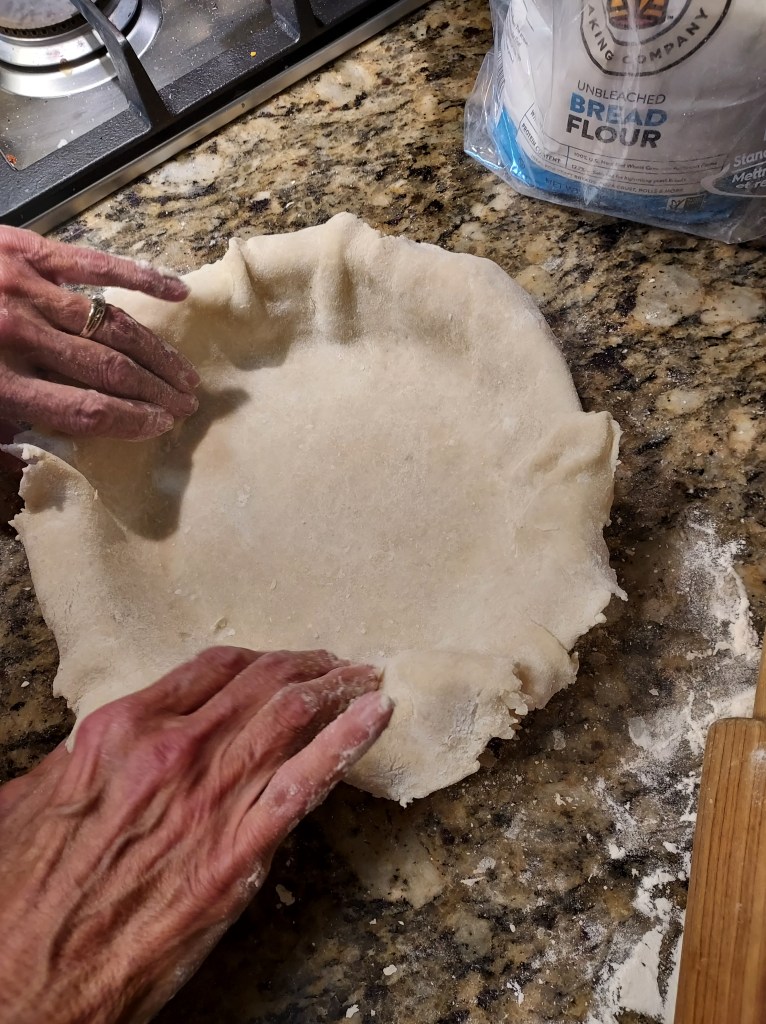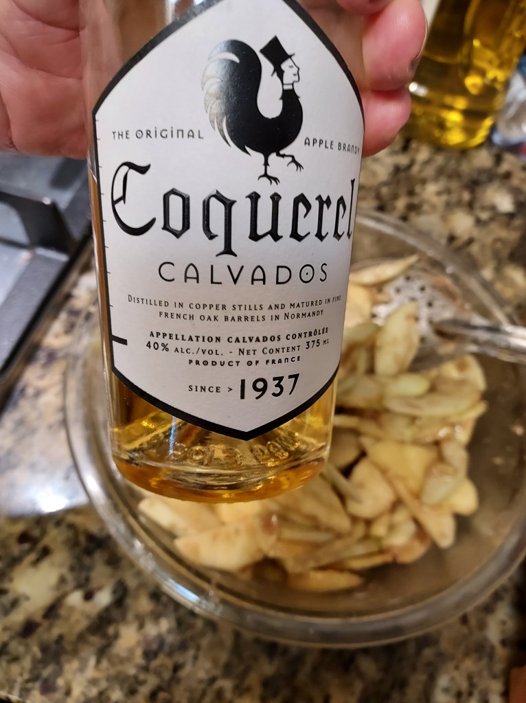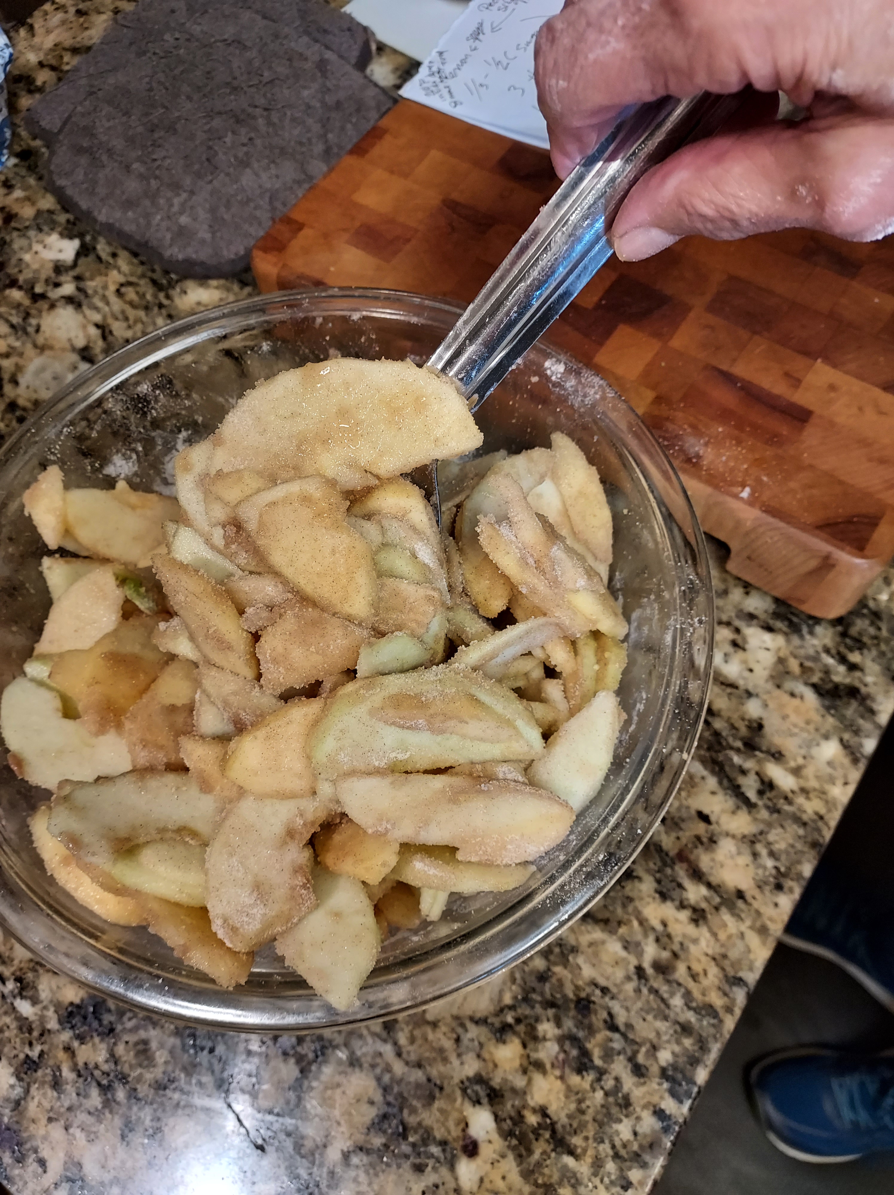 Slice 6 apples dot with lemon juice. Coat with 2/3 cup sugar, 3 tablespoons flour, 1/4 teaspoon each, nutmeg, Cinamon, and cardamon.1 tablespoon Calvados apple brandy.Roll out 1/2 of dough to 1/8-inch and about 12 inches or more roundPlace in bottom of pie dish. Add apples.Roll the rest of dough same as before. Cut a round circle, slice dough and lattice on top, crimping the edges together.Brush with egg wash and sprinkle with sugar. I used raw sugar.Bake the pie at 375°F until lightly brown, 40 to 60 minutes, then 350°F for 20 or so minutes.Perfect with Vanilla Bourbon Salted Caramel https://pamstacticalkitchen.com/2016/09/21/ice-cream/Ice Cream and Salted Chttps://pamstacticalkitchen.com/2016/09/20/salted-caramel-sauce/aramel Sauce links below. https://pamstacticalkitchen.com/2015/12/04/best-pie/