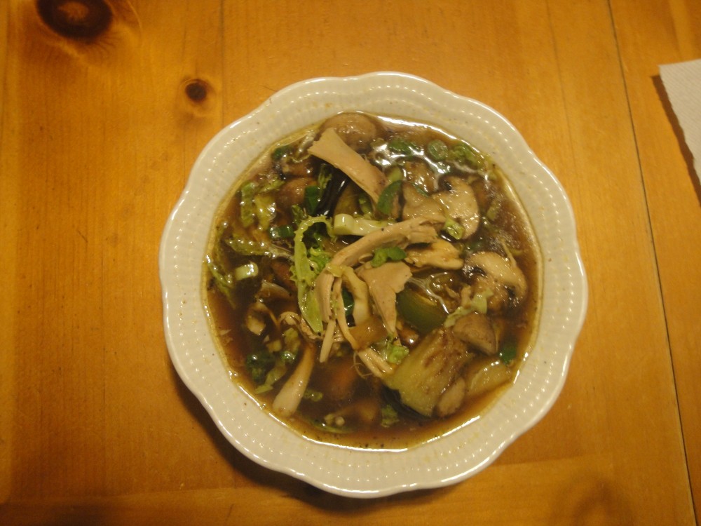 Hot LunchChicken Soup That’s steam and aroma fogging up the photo, once you’ve had this you’ll never go back to canned. After roasting a chicken, save the drippings from the roasting pan and some good meat and set aside. Put all the reaming bird, everything fat, skin, bone, meat, in a crock pot or on the stove, cover with cold water, add about 1 tablespoon of vinegar, and soak for 1-2 hours, gently cook for 24-48 hours on very low heat. If you have vegetables (except in the broccoli or cabbage family they make broth bitter ,but you can add them at the end), that are old or not pretty or what ever, clean them up and add too. What you’ve done now is suck out all the great flavors and nutrients, so you toss everything but the broth. Decant and refrigerate, when cold, skim off the top layer of fat, now sauté your favorite vegetables, and add them along with the good meat you set aside and the juice from the roasting pan (skim the top fat off that too). Enjoy, this is truly a wonderful food, and great now during winter season. It’s well-known to help with a cold or flu too. |