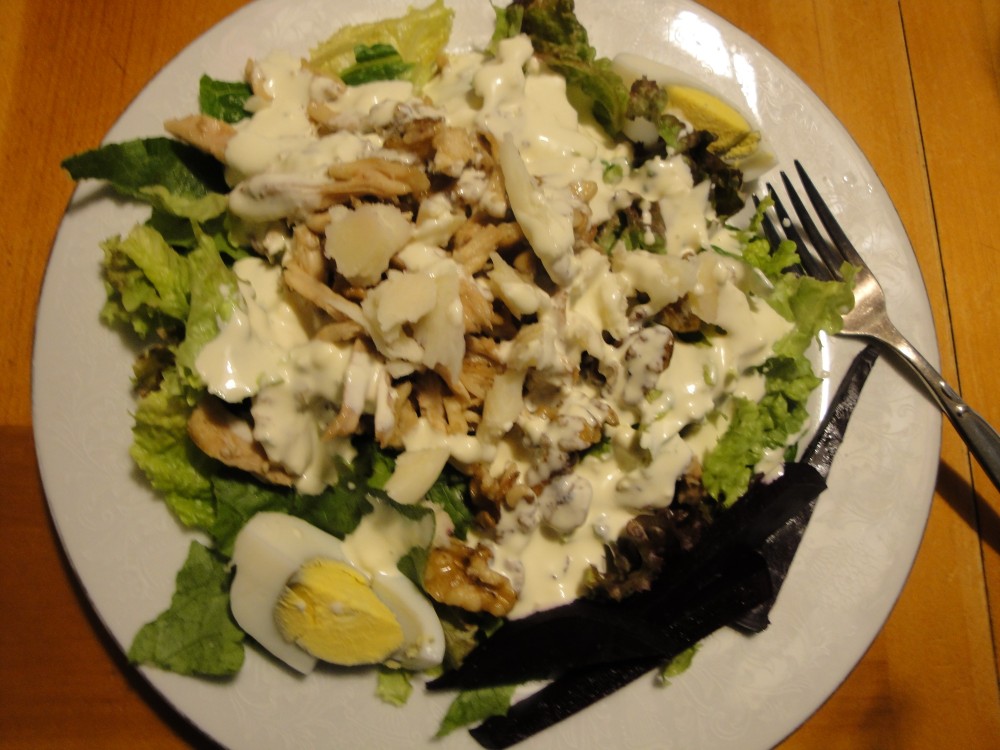 This, salad is an easy use for left over prime rib, and it’s still flaky tinder & juicy. Heres’s How I make it: Pile shredded or tossed lettuce into a mound in the center of plate. Reheat meat, 2-5 minutes under the broiler. careful don’t over do it, just take the chill off. Slice thin, layer it on top the lettuce, now add cheese, onions, olives, guacamole, put some hot peppers on the side for an option. We use my live culture blue cheese dressing. |