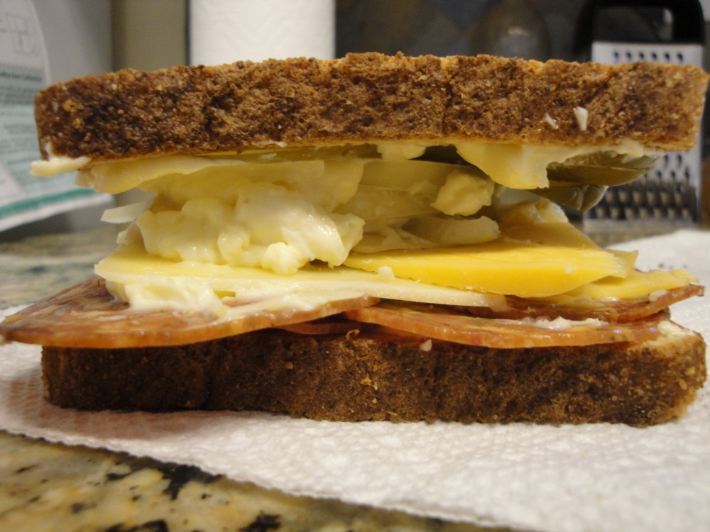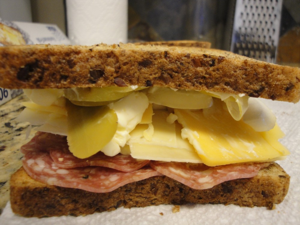 Lunch or Dinner SandwichSome times it’s so nice to bring food with you, that’s clean and healthy. The organic sprouted wheat bread, holds up well for this. More stores are now carrying the uncured salami. Bubbies pickles are probiotic of course. Aged cheese, and my home-made mayonnaise, and you’re talking a great sandwich. |