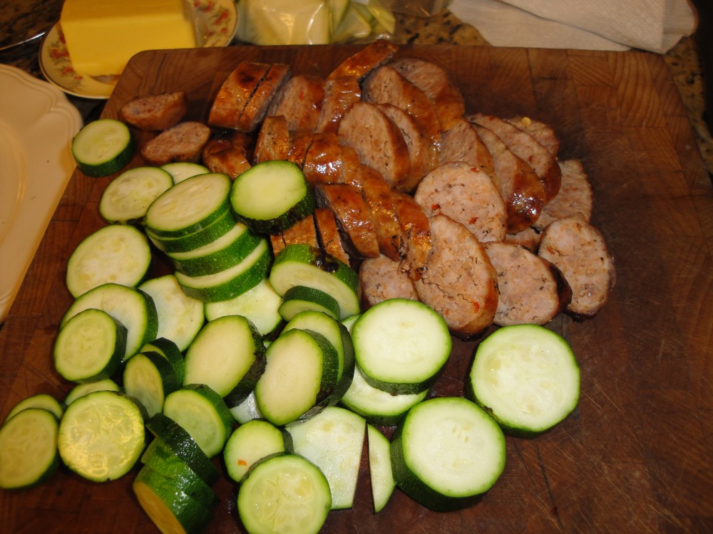 Grill sausage on med-high, and squash on the side away from the flame. Flip every 3-4 minutes, untill all sides have sear marks. Remove and let cool. Melt butter on med-low heat. Slice sausage and squash, add to pan and flip to coat with butter. Cover with lid and cook approx. 3-5 minutes or done as you like. Plate and top with cheese. |