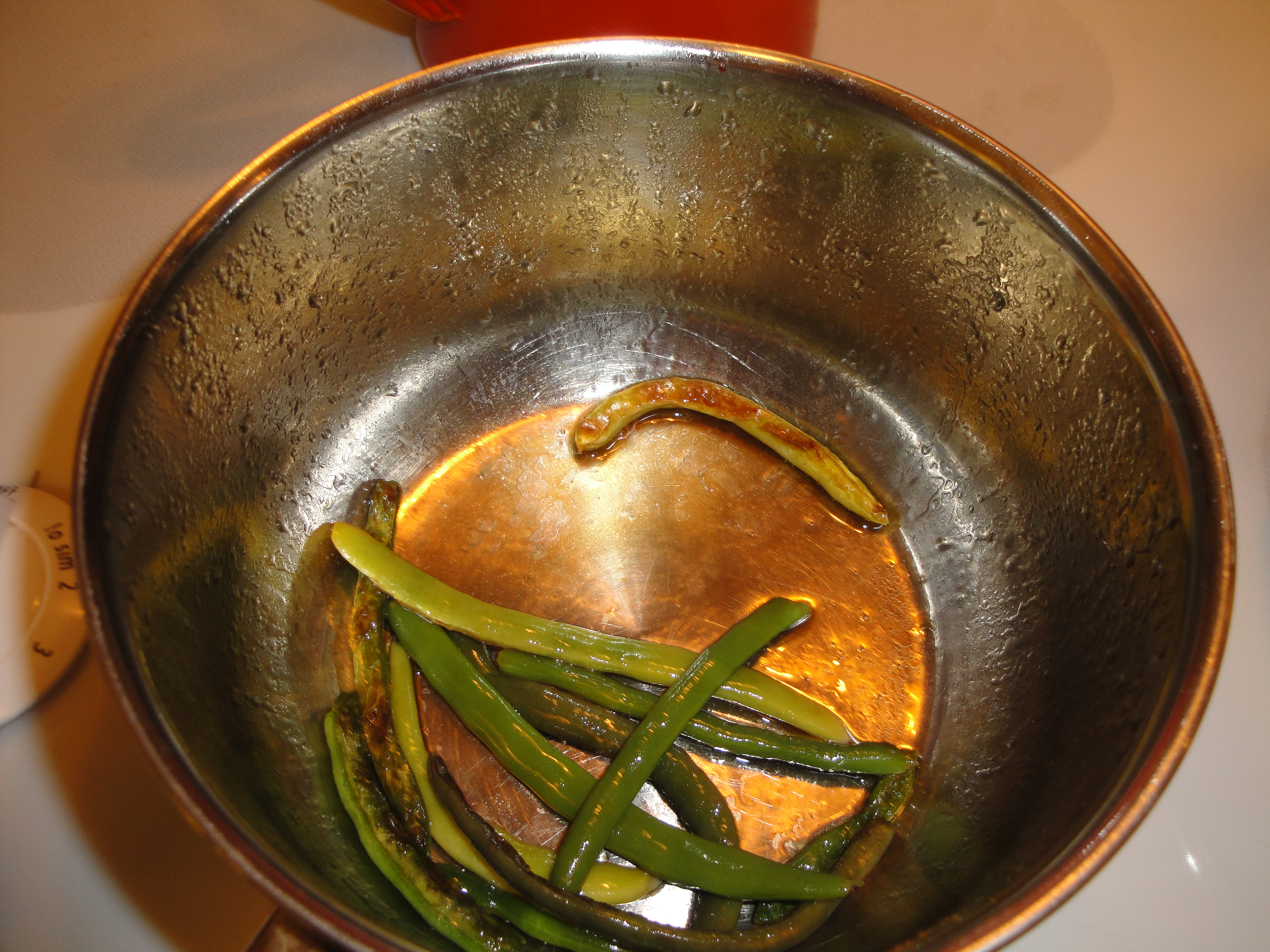 Clean and remove strings from beans. Cook bacon in pan the beans will cook in. Remove bacon when done and save, cook beans in the bacon fat with a little salt and water. Cook on medium covered with a lid, 15-25 minutes, until tender, but still bright green. Remove lid and turn burner on high. The idea here is to char the beans, pretty much the same as you would meat on a BBQ grill. Keep a close watch, and turn them a lot. When they look like in the picture, but them in a serving bowl, and top with crumbled bacon. Enjoy! |