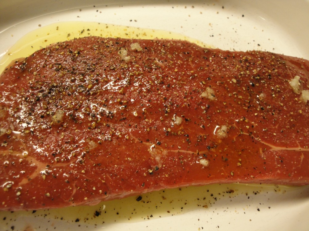 Cover with olive oil, 1 clove pressed garlic, about 1 teaspoon salt, and pepper. Turn and repeat on other side. Let meat come to room temperature. Pre-heat grill, to 450-500. Grill meat 4-5 minutes on the first side, and 3-4 on the second. Let meat rest 5 minutes then slice thin at angle. Drizzle olive oil, and serve. |