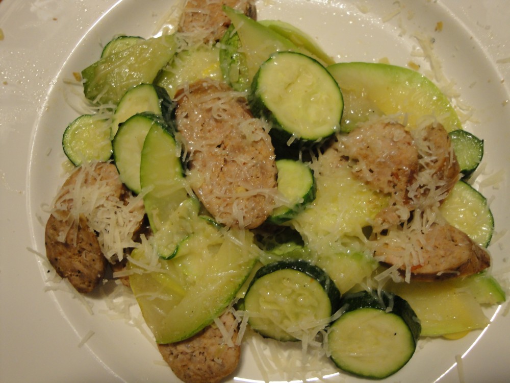 Spread shredded zucchini on clean tea towel. Wring, twist, and snake it to get as much water out as possible. Spread across a cookie sheet, and place in a low oven 15-20 minutes, check, to keep from burning. To make sauce, simmer down the tomato sauce 5-10 minutes, add fresh pressed garlic, salt & pepper. Simmer meat on med-low in butter, also adding garlic, salt & pepper. When lightly cooked, add to sauce with torn pieces of fresh herbs. Sautéed onions, peppers, mushrooms, and olives, are an option. Placed the baked zucchini on plate, top with spaghetti sauce, top with dry cheese. Enjoy! |
