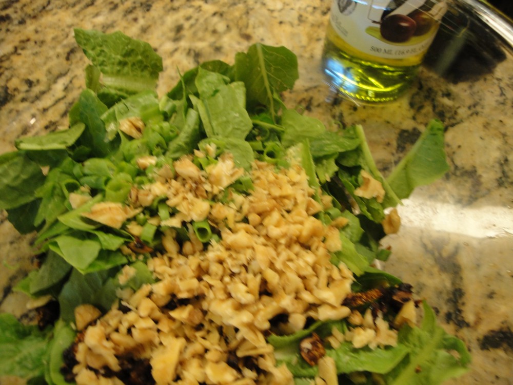 Press garlic and add all dressing ingredients, into a jar, shake well. The real key to this is using very good quality olive oil. To make salad; tear salad greens, chop walnuts, slice cheese with a vegetable peeler, crumble olives and toss well. Dress salad and enjoy. |